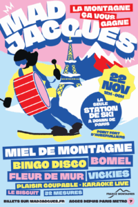 La seule station de ski accessible en métro ! La Mad Jacques transforme le Point Fort d’Aubervilliers en village de montagne pour un after-ski géant! 12h de turbo-teuf terroir ambiance montagne : musique live, vin chaud, fromage et animations à gogo.Le plus grand festival de montagne à basse altitude, accessible avec ton pass Navigo.